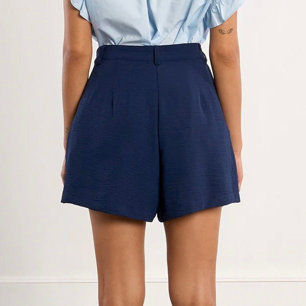 The Molly Bracken Pleated Flare Shorts feature a high-waisted design that promotes a flattering silhouette. The flared fit enhances comfort and ease of movement, while the zip and button fly closure ensures a secure fit. With practical side pockets, these navy blue shorts combine functionality with style, making them suitable for various occasions.