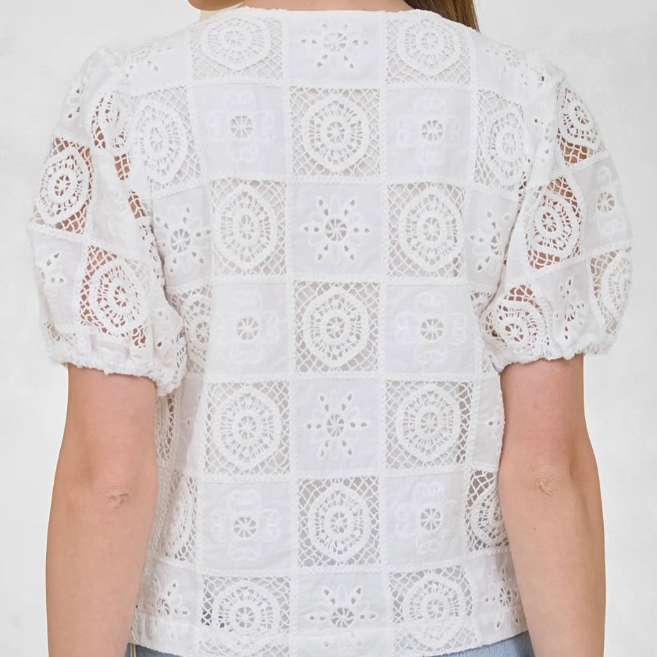The Zoe & Claire Embroidered Eyelet Button Top features a white lace embroidered design and short puffy sleeves. This garment combines elegance with breathability, making it ideal for warm weather. The eyelet detailing provides ventilation, while the button-up style enhances versatility for both casual and formal settings.