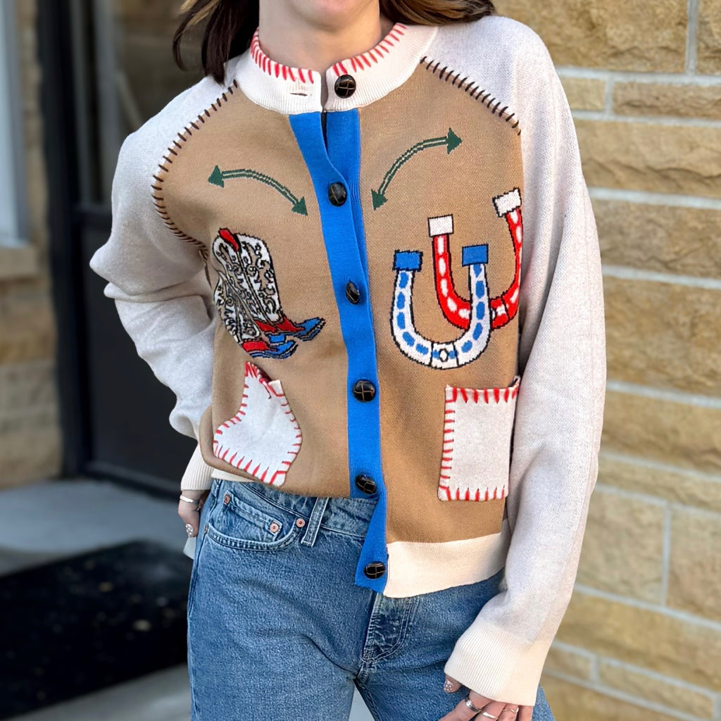Upgrade your wardrobe with our Ladies THML Western Theme Embroidered Cardigan. This stylish and versatile cardigan features intricate embroidery inspired by Western themes. Made with high-quality materials, this cardigan is perfect for adding a touch of elegance and style to any outfit. Bring a unique flair to your wardrobe with this must-have piece.LADIES THML WESTERN THEME EMBROIDERED CARDIGAN